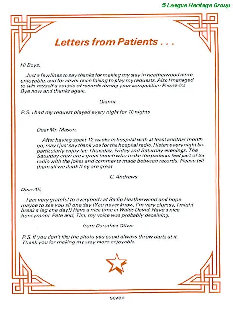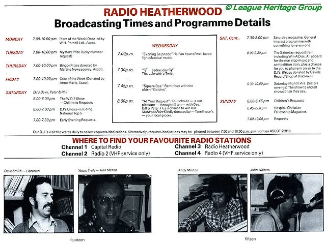 A fortnightly program on Thursday nights called Heatherwood beat, was broadcast. A member of the local constabulary would come and answer questions from patients.