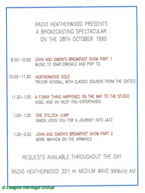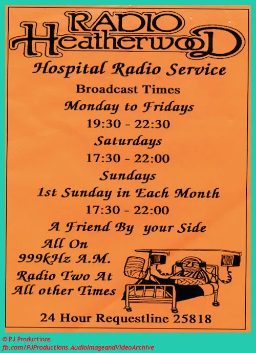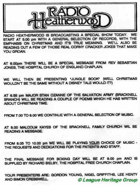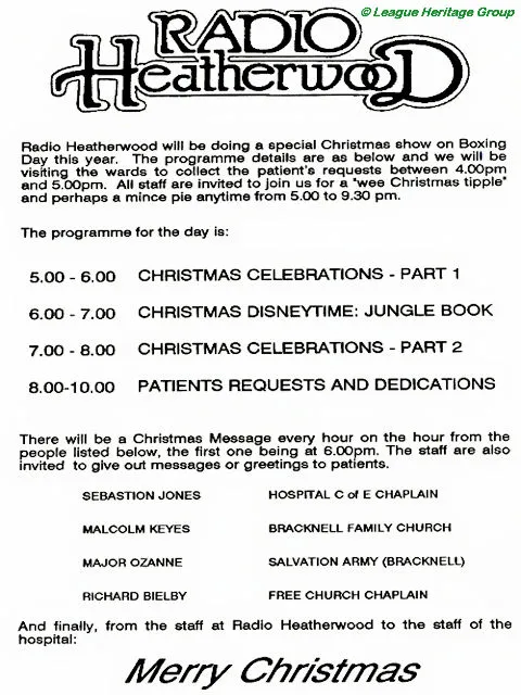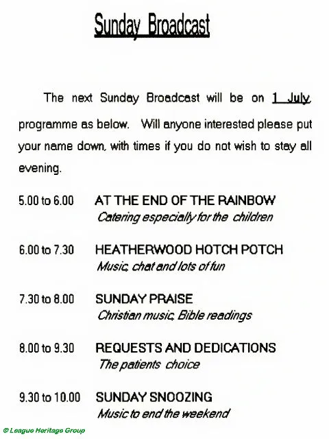 One program during the day; proved so popular that it became a permanent feature of Radio Heatherwood Sunday shows'-Sunday Praise. The half hour show featured a variety of music, not just Hymns but general music carrying the Christian message of love and forgiveness. The Hospital Chaplain, Rev Sebastian Jones provided a "Thought For The Day".