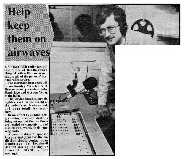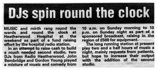 On Sunday 4th March. Radio Heatherwood held it's first "Radiothon" 12 hours of non-stop broadcasting. The day started at 10.00 am, the first record being "Rock Around The Clock"!. A team of presenters went round the wards collecting requests from the patients. The patient's requests were broadcast throughout the day.