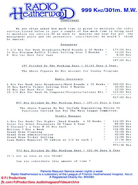 Back to TopOften asked was how much time do we spend in providing the radio service. The information sheet here was collated by the station secretary and displayed on the internal notice board for everyone to see
