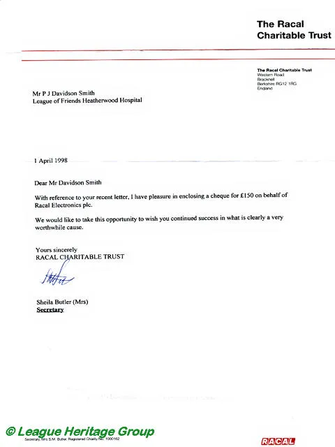 On Thursday 9/4 a late arrival from all the letters sent out regarding Grand Draw support. A donation of £150 from Racal Charitable trusts. We last wrote to them in 1987 when they supported the radio appeal.
