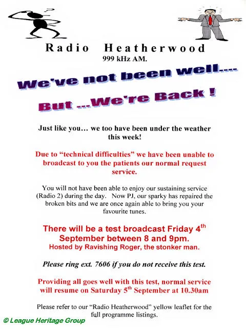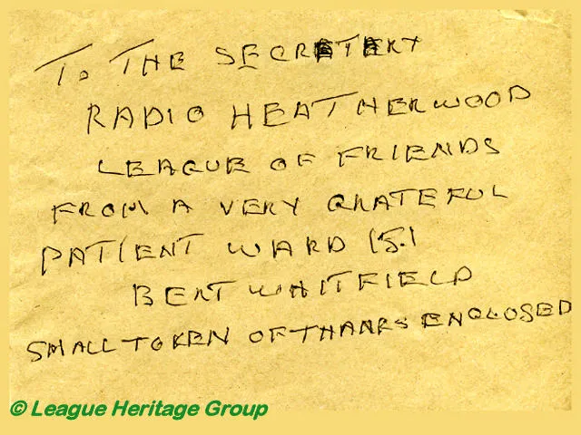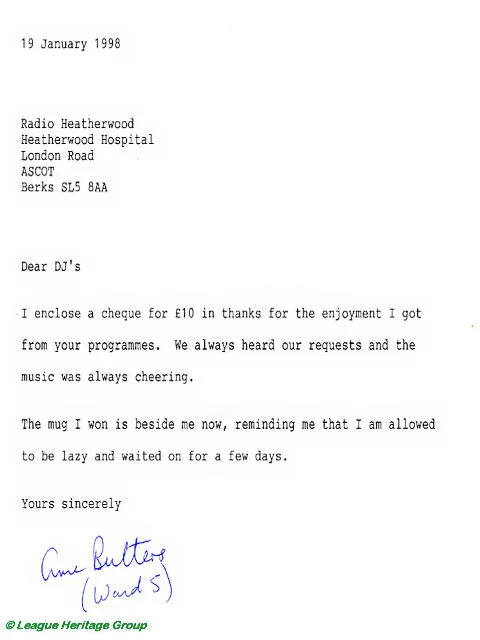 The enclosed(£10) is a thank you towards another radio or what ever, if you've got to be in hospital- you can't beat Heatherwood and your radio service is the icing on the cake.