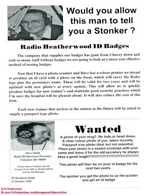 At the end of 1998 it was decided id badges would no longer be purchased with the presenters name engraved on them. We would produce our own and also show an id picture as well.