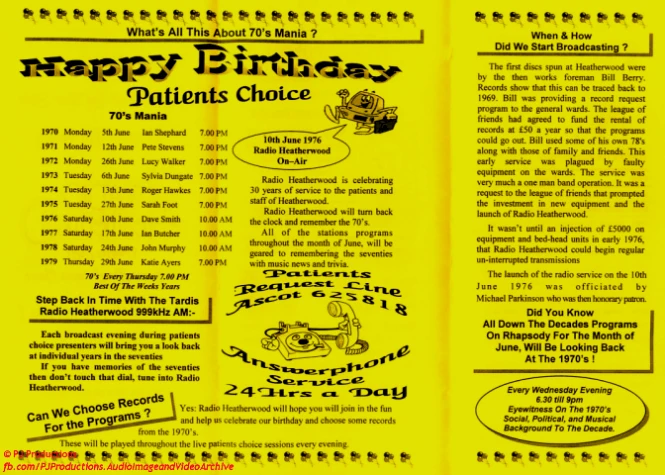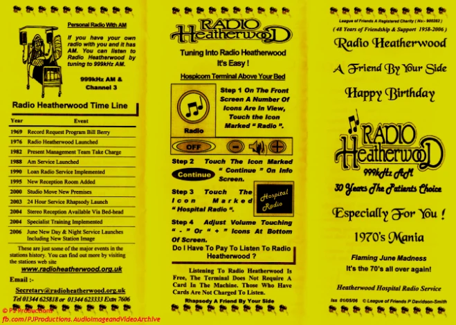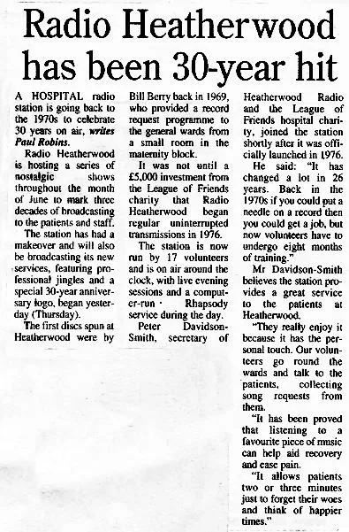 Mr Michael Fenn Who was visiting his son on ward 1, Told me that he spent 10 day in Heatherwood himself not long ago. He listened to Radio Heatherwood every night. He was very impressed with the friendly radio staff and the music that was played throughout the night.