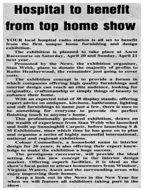 The first press article appears in the Bracknell news. for the home furnishing exhibition which will be held in April 1991. The station is set to benefit from the proceeds of the exhibition.